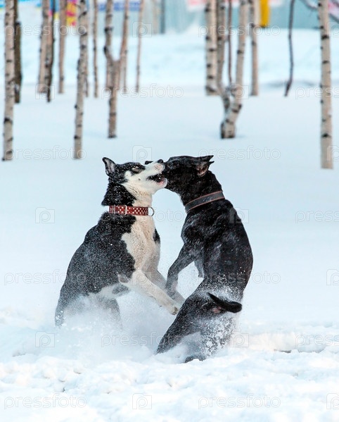 Две собаки на снегу в зимнем лесу в Ноябрьске. Винтажный стиль