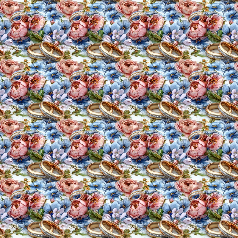 Широкий свадебный узор с обручальными кольцами, розовыми пионами и голубыми ромашками