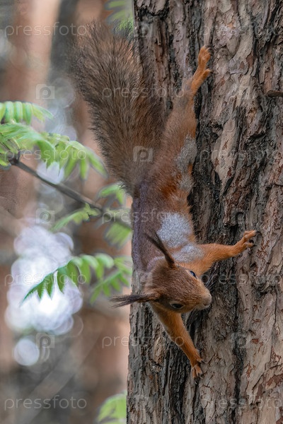 Лесная белка бегает и прыгает по деревьям в поисках еды