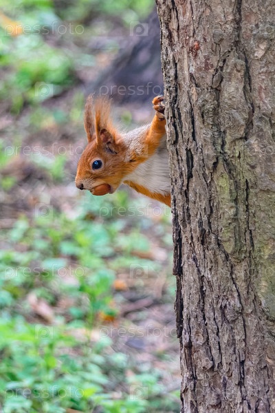 Лесная белка бегает и прыгает по деревьям в поисках еды