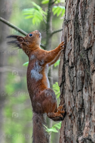 Лесная белка бегает и прыгает по деревьям в поисках еды