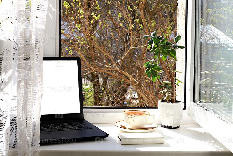 Чашка чая, компьютер, цветок толстянки в горшках на солнечном окне. Концепция домашнего уюта, комфорта и домашнего офиса. Компьютерная мобильность и здоровый образ жизни, избирательный фокус