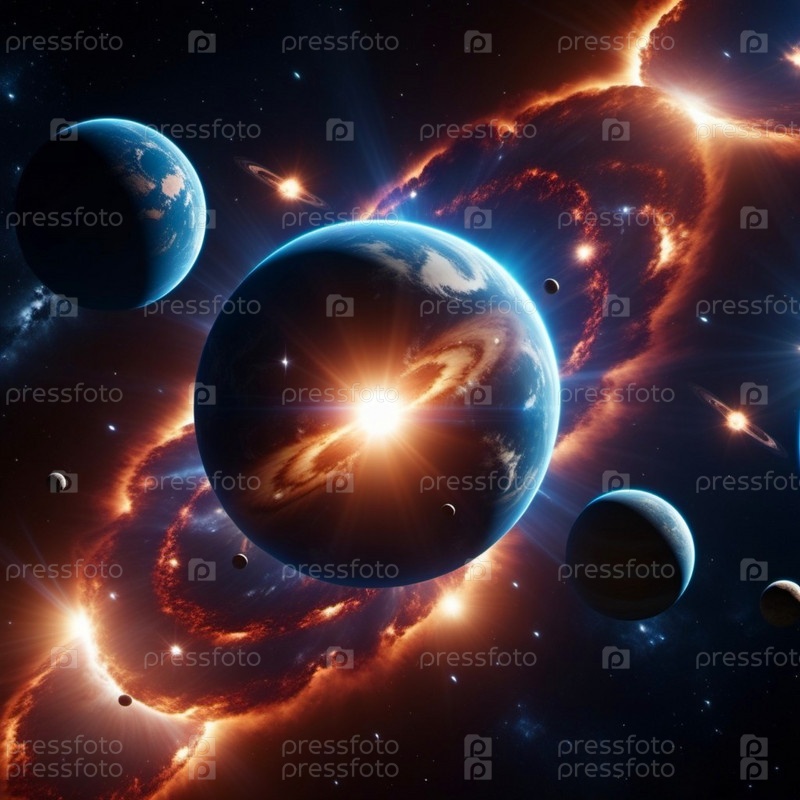 Потрясающее изображение множества планет разного размера, выстроенных на фоне ярко освещенной туманности, с сияющей звездой, излучающей яркий свет в центре