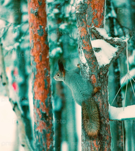 Белка на дереве в зимнем лесу в Ноябрьске. Зимняя природа