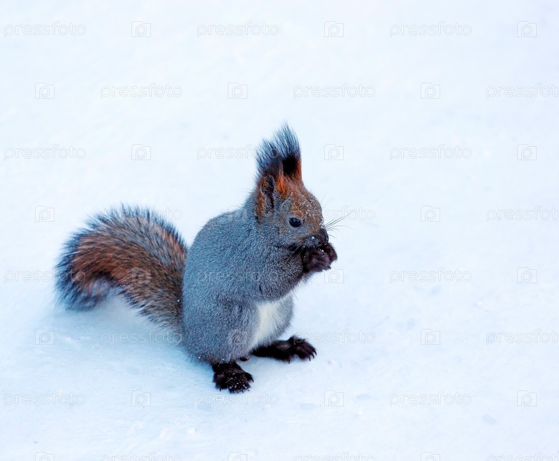 Белка на снегу в зимнем лесу в Ноябрьске. Крупный план