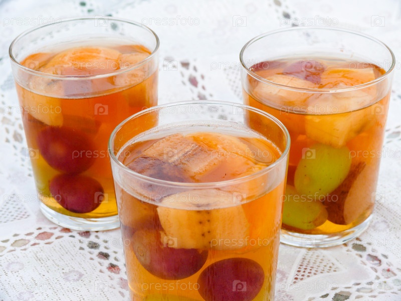 Оранжевый компот из фруктов на белой кружевной скатерти