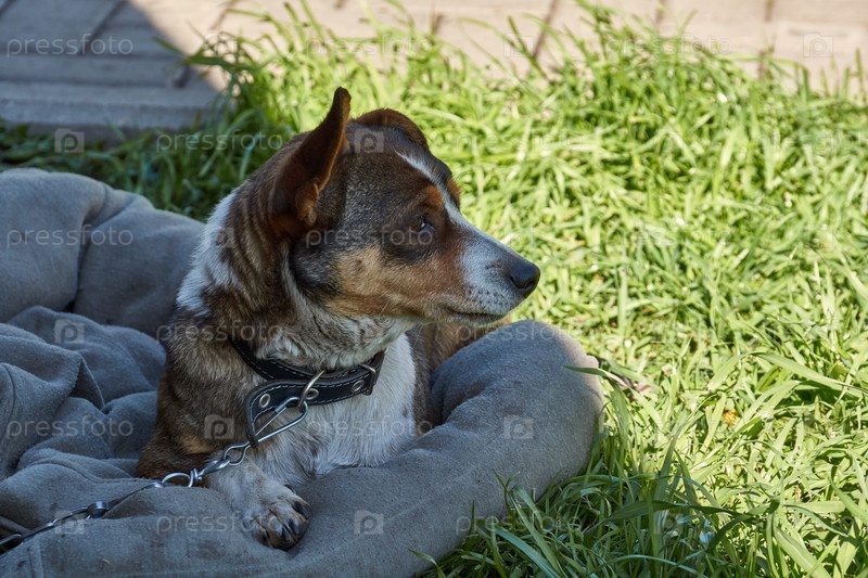 Собака лежит во дворе дома на лужайке и греется в лучах весеннего солнца. Весна