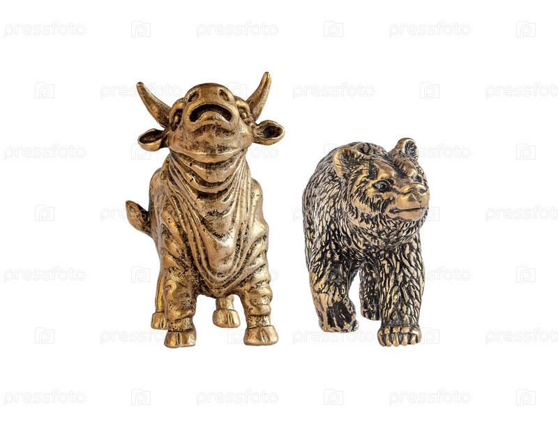 Изолированное изображение фигурок желтого металлического быка и медведя. Понятие о символе биржевой торговли, взаимодействие покупателей и продавцов. Серия изображений