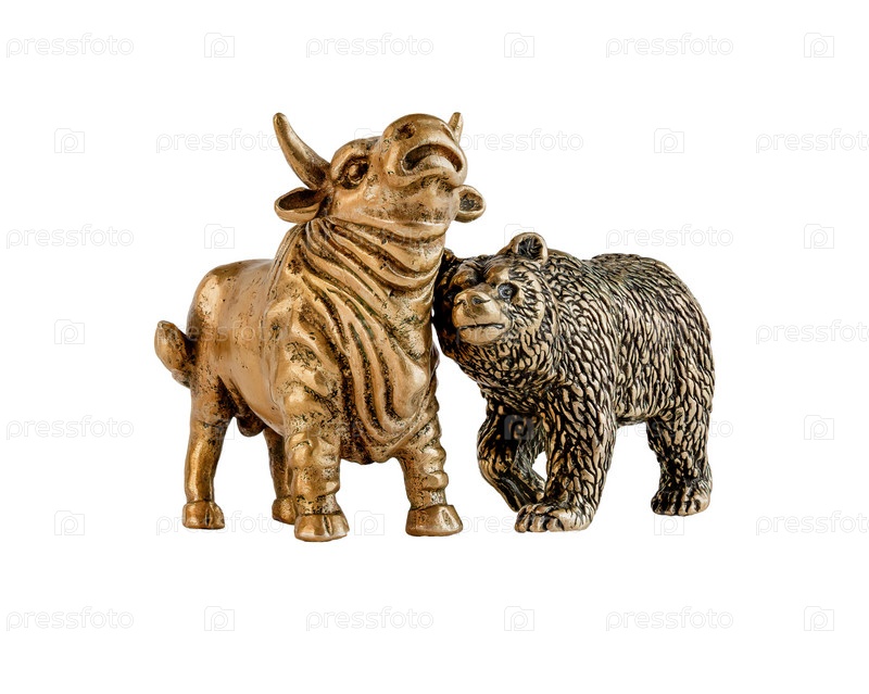 Изолированное изображение фигурок желтого металлического быка и медведя. Понятие о символе биржевой торговли, взаимодействие покупателей и продавцов. Серия изображений