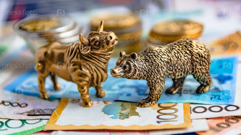 Бронзовые фигурки быка и медведя украшены бумажными и металлическими монетами. Размытие фона. Символ и концепция торговли на фондовой бирже