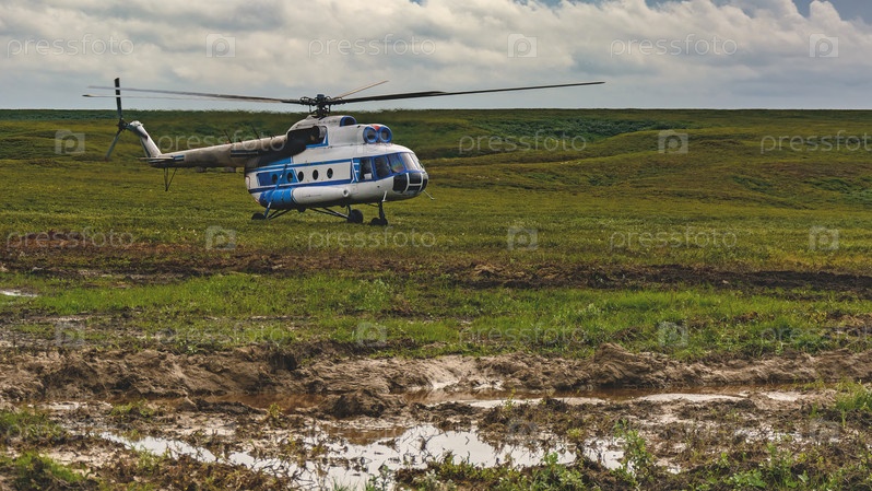 Пассажирский вертолет Ми-8 совершил вынужденную посадку в северной летней тундре. Красивое облачное небо на горизонте. Зеленая трава