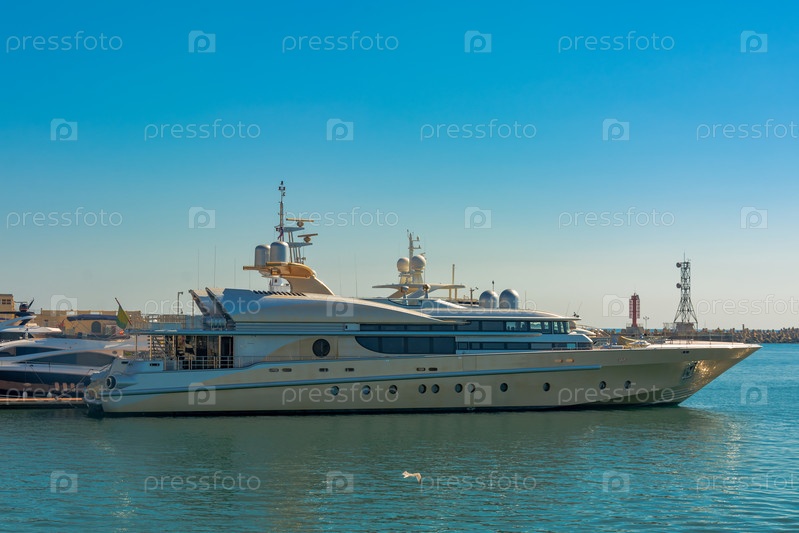 Морской порт летом. На пристани стоит множество разных яхт и катеров. Яхтсмены и путешественники готовятся к выходу в море. На фоне здания приморского города