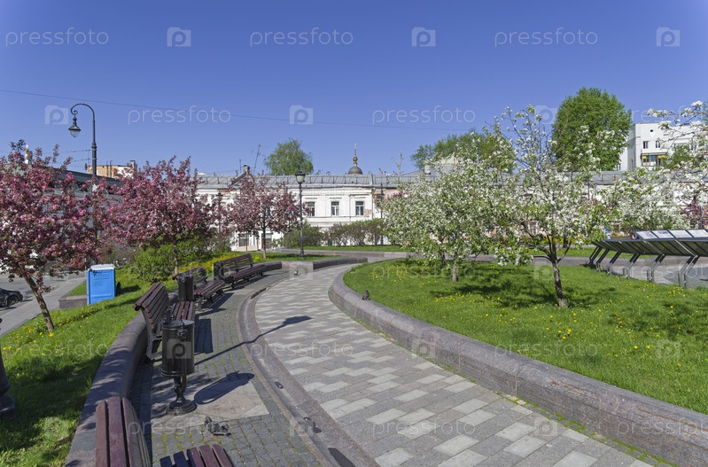 Цветущие яблони на Хитровской площади. Москва, Россия, солнечный день в мае