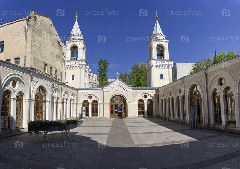 Двор собора Усекновения Главы Иоанна Предтечи в Иоанно-Предтеченском монастыре (с видом на колокольни). Москва, Россия, солнечный день в мае
