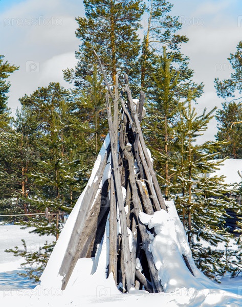 Красивая деревянная хижина в снегу в сосновом лесу зимой в Ноябрьске