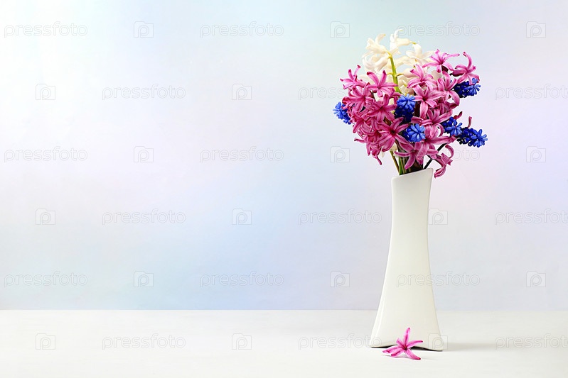Красивые весенние цветы гиацинты и мускари в вазе на светлом фоне, флаер. Абстрактная цветочная композиция, натюрморт с местом для текста, цветочная праздничная открытка, концепция летнего приветствия, выборочный фокус