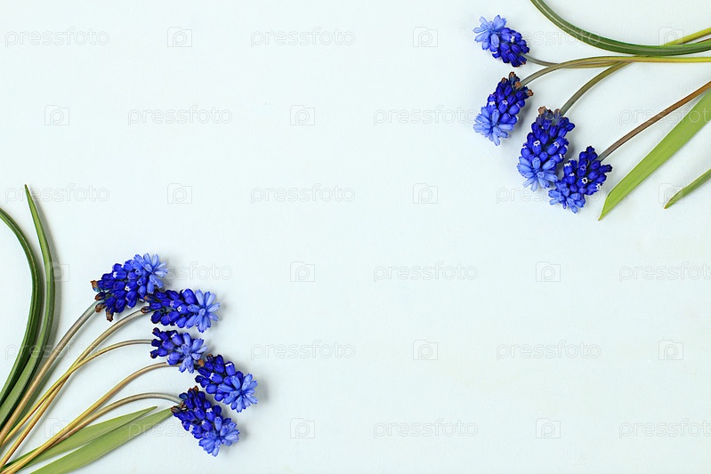 Абстрактная цветочная композиция, красивые весенние цветы мускари на светлом фоне, баннер, натюрморт с местом для текста, цветочная праздничная открытка, концепция летнего поздравления,