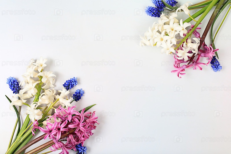 Красивые весенние цветы гиацинты и мускари на светлом фоне, баннер. Абстрактная цветочная композиция, натюрморт с местом для текста, цветочная праздничная открытка, концепция летнего приветствия, выборочный фокус