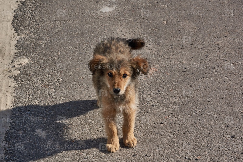 Щенок идет по дороге возле своего дома. Весна