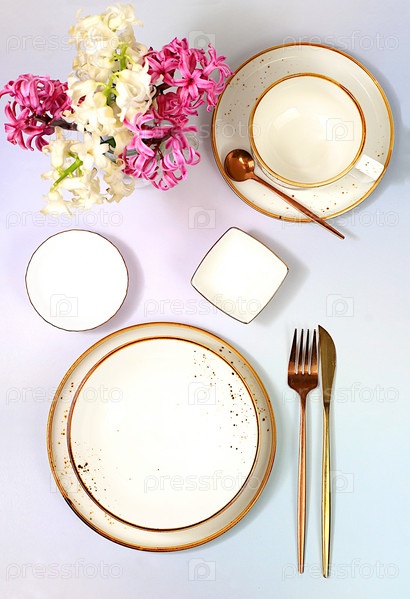 Столовые приборы с цветами на тарелке на мраморном фоне. Элегантная праздничная сервировка стола, оформление меню в кафе или ресторане, праздничная композиция с букетом гиацинтов, кухонный фон. Селективный фокус