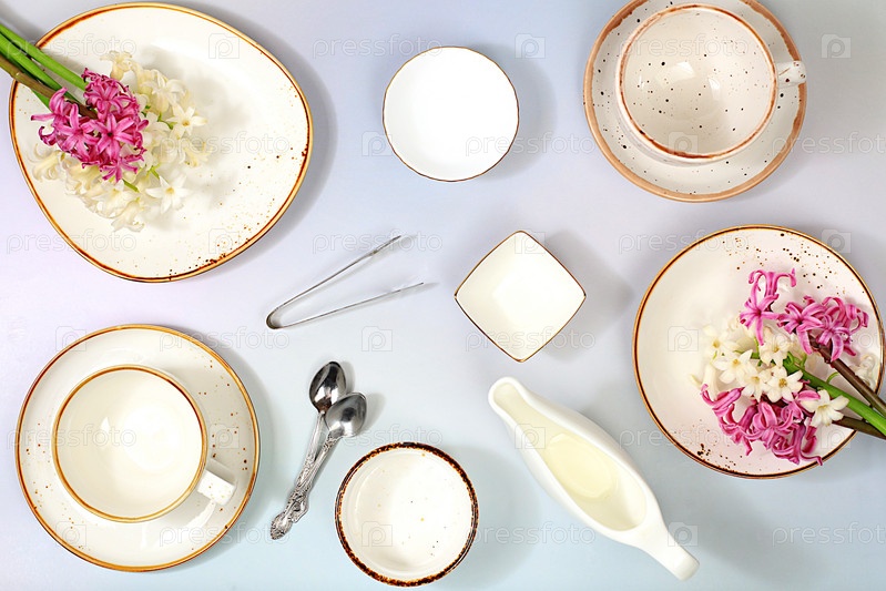 Элегантная праздничная сервировка, макет меню в кафе или ресторане, столовые приборы с цветами на тарелке на мраморном фоне, праздничная композиция с букетом гиацинтов, кухонный фон