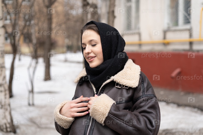 Молодая красивая женщина позирует в платке на улице зимой