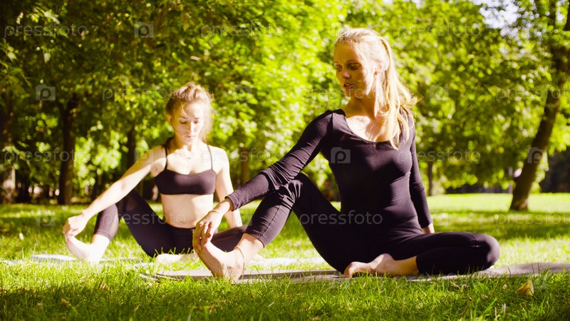 Йога. Две привлекательные женщины занимаются йогой в парке