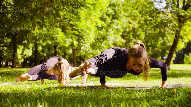 Йога. Две привлекательные женщины занимаются йогой в парке