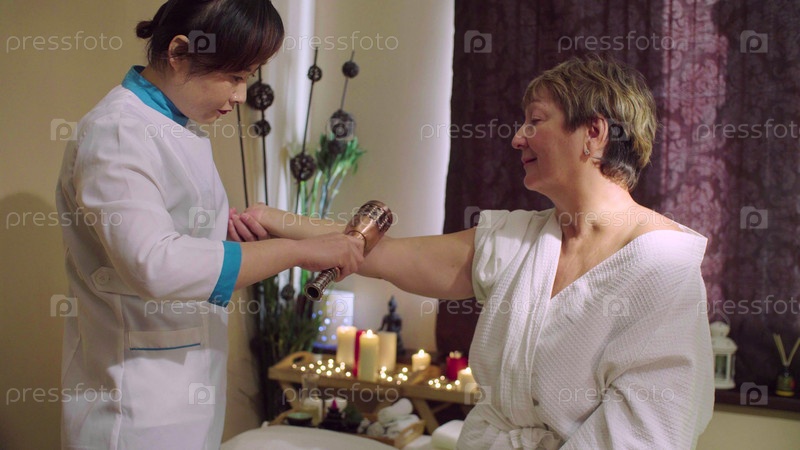 Молодой китайский врач делает массаж пожилой женщине
