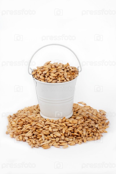 Белое ведро, полное ячменя, стоит на куче ячменя