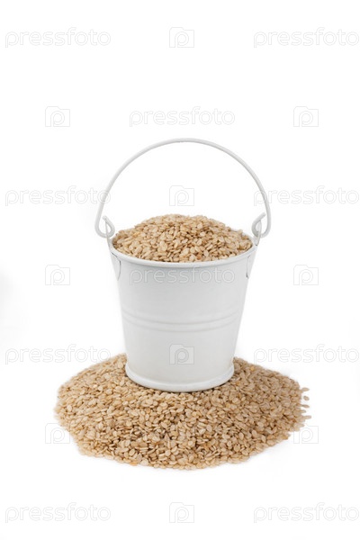 Белое ведро, полное кунжута, стоит на куче кунжута