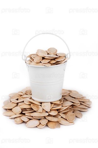 Белое ведро, полное тыквенных семечек, стоит на куче тыквы