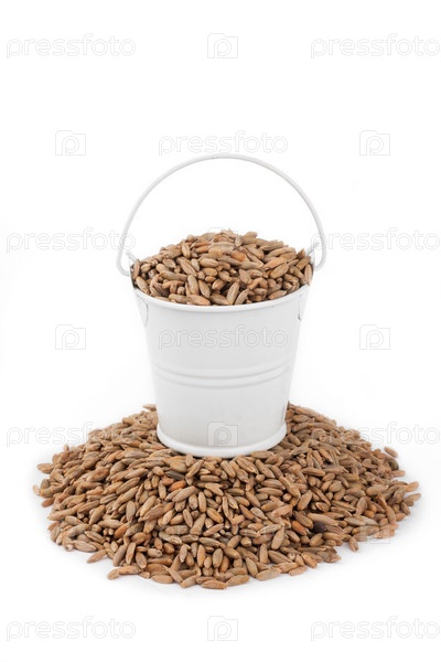 Белое ведро, полное ржи, стоит на куче ржи