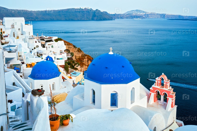 Знаменитый вид с точки зрения деревни Санторини Ия с голубым куполом греческой православной христианской церкви