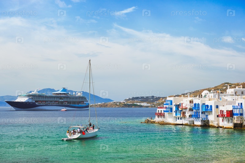 Маленькие венецианские дома в городе Хора Миконос с яхтой и круизным лайнером. Остров Миконос, Греция