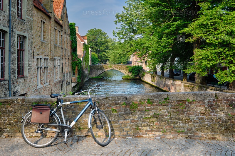 Велосипед на мосту возле канала и старых домов. Брюгге Брюгге, Бельгия