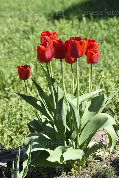 Красные цветы тюльпана на фоне зеленой травы в весеннем саду. Красные бутоны тюльпанов на зеленом фоне в течение дня