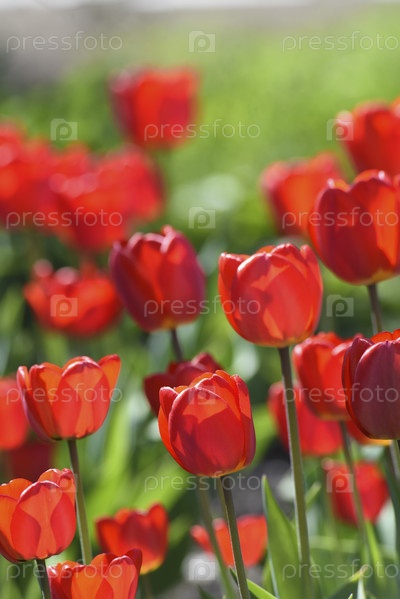 Красные цветы тюльпана на фоне зеленой травы в весеннем саду. Красные бутоны тюльпанов на зеленом фоне в течение дня