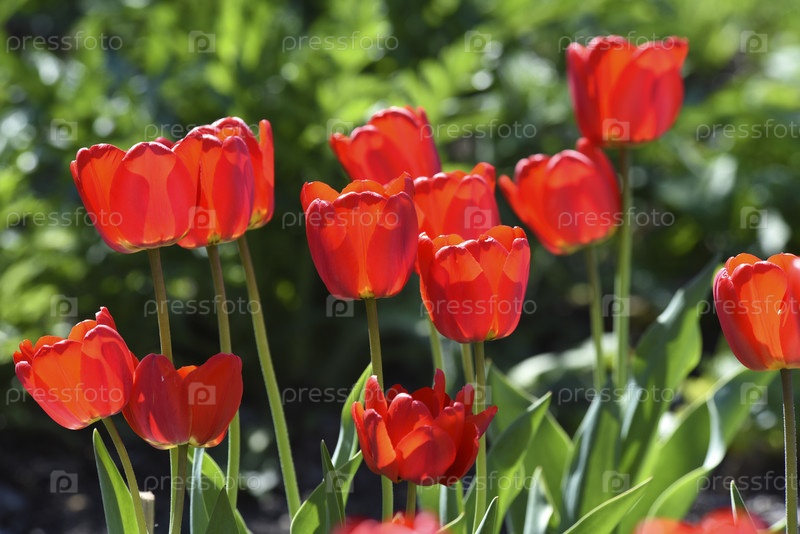 Красные цветы тюльпана на фоне зеленой травы в весеннем саду. Красные бутоны тюльпанов на зеленом фоне в течение дня
