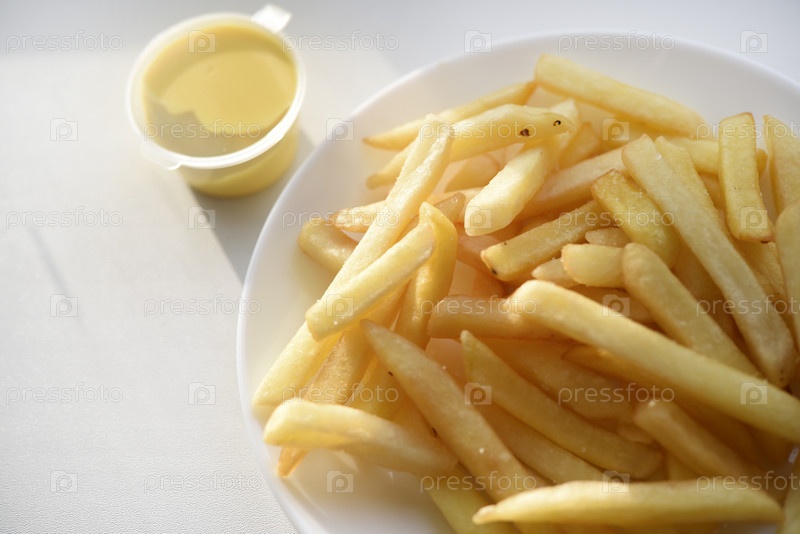 Картошка фри на белой тарелке с соусом. Вкусный жареный хрустящий картофель