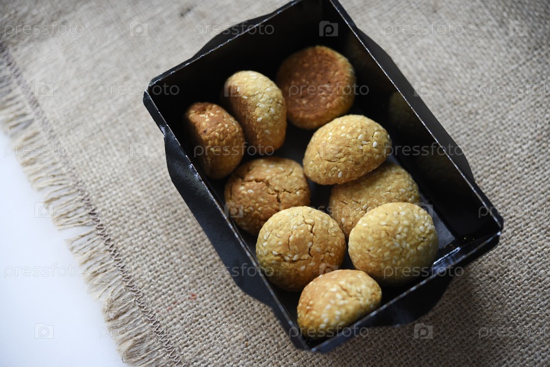 Сладкое кунжутное печенье в картонных коробках на мешковине. Печенье в коробке