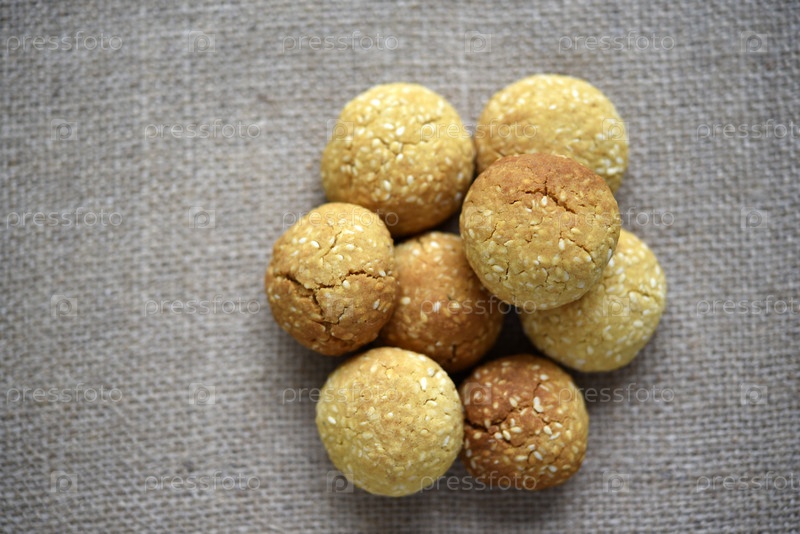 Куча печенья с кунжутом на мешковине. Сладкое сахарно-желтое печенье