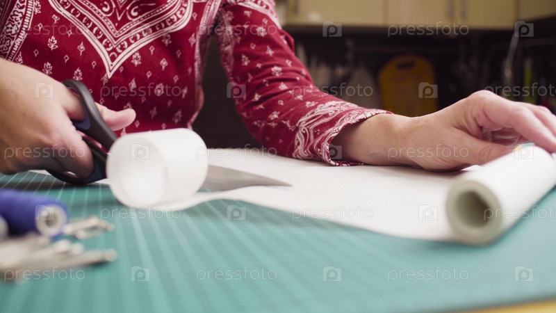Руки женщины средних лет ножницами режут бумажный шаблон. Ткань ручной работы