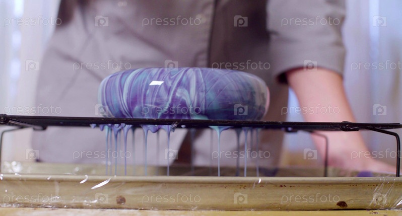 Торт, залитый цветной зеркальной глазурью, находится на сетке