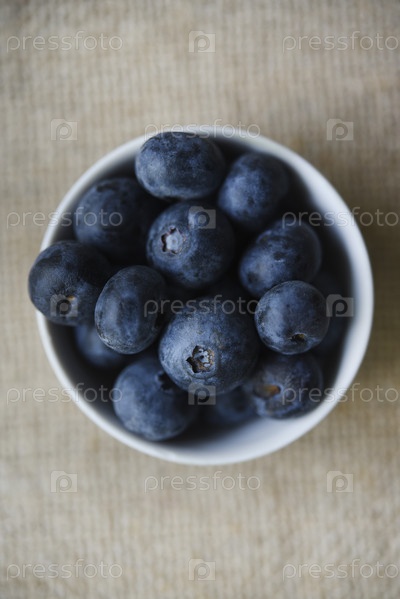 Черника в белой миске на скатерти из мешковины. Сочная черника