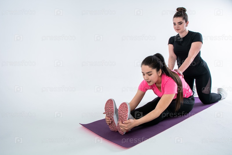 Две фитнес-девушки делают растяжку и акробатические фигуры