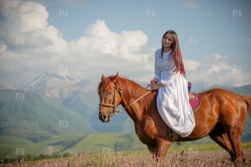 Кыргызская девушка азиатской национальности скачет на лошади в белом платье