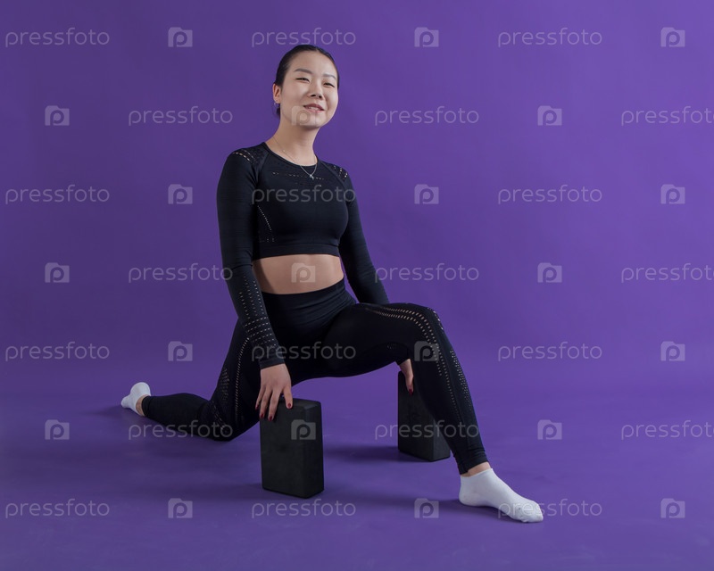 Фитнес-девушка выполняет спортивные упражнения на фиолетовом фоне