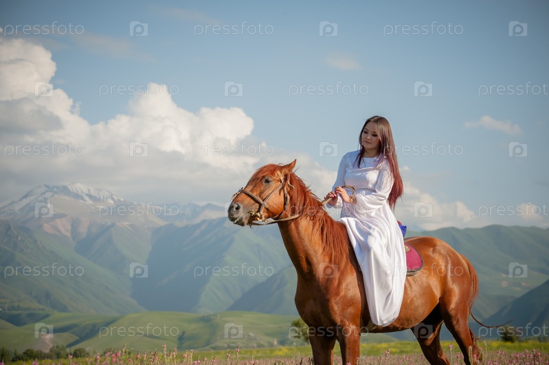 Кыргызская девушка азиатской национальности скачет на лошади в белом платье