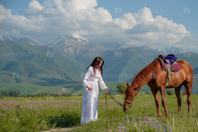 Азиатская девушка (кыргызка) в белом платье гуляет с лошадью на природе на фоне гор, Бишкек, Кыргызстан
